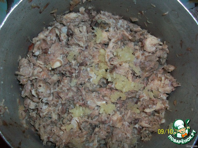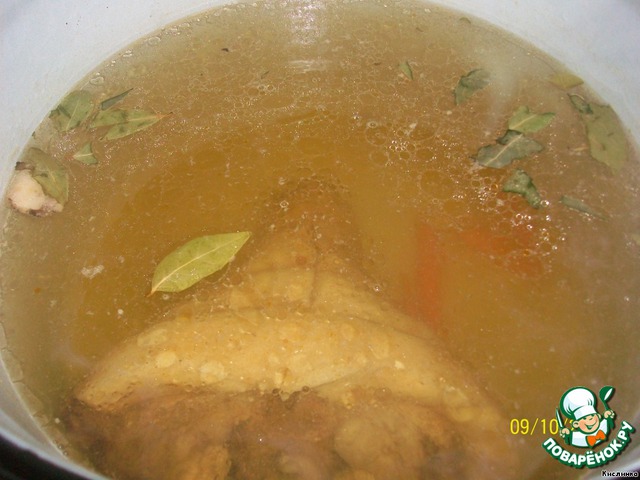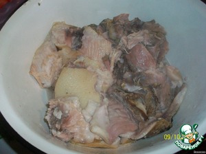 • Затем сливаем всю жидкость через дуршлаг (этот бульон я потом использовала для супа). Из мяса выбираем кости.