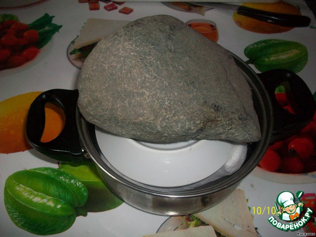 • Узелок кладем в кастрюльку, на него тарелку, а сверху груз. В качестве груза я использовала камень. Далее выставляем на холод или в холодильник на ночь (или на несколько часов).