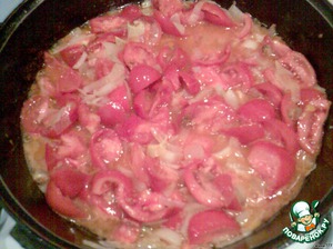 Тыковку не тушите слишком долго, чтобы она не развалилась. В отдельной посуде растопить топлёное масло, добавить порезанные лук и помидор, и так же немного потушить.