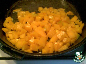 Пока варится мясо, приготовим не зажарку, а "затушку". Выражаюсь так, потому что вместо жарки овощи мы будем тушить. Тыкву очистить, порезать кубиками, сбрызнуть яблочным уксусом и тушить с небольшим количеством топлёного масла и водички.