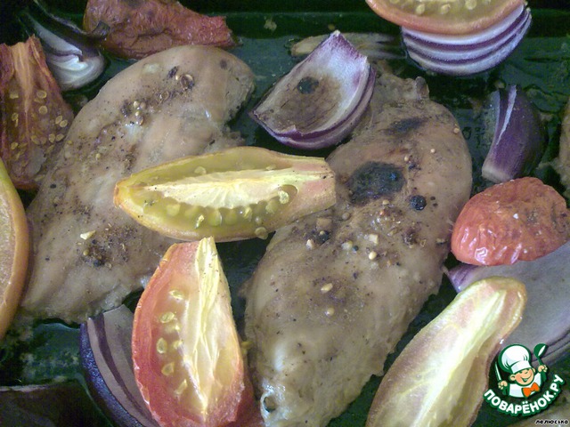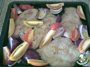 • Уложить замаринованное филе в форму посыпать приправой и обложить нарезанными луком и помидорами, которые сбрызгиваем оливковым маслом и солью.
