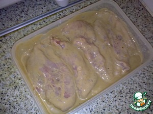 • Куринное филе промыть, обсушить и замариновать в смеси сливок и гранатового соуса на 10 минут.