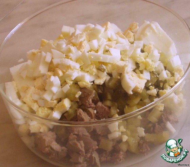 Также маленькими кубиками порезать предварительно отваренные яйца или натереть на терке.