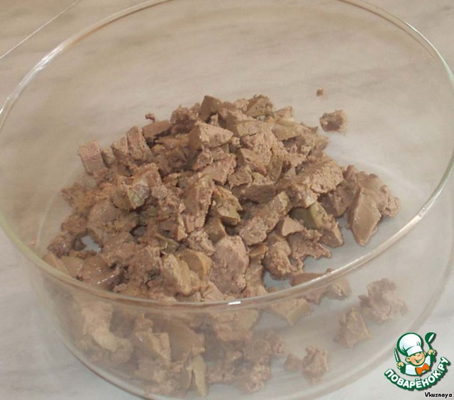Куриную печень отварить, охладить, затем мелко порезать или натереть на терке.
