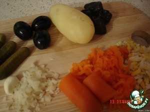 Картофель, морковь, яйца, маслинки трем на терке, чернослив, лук, огурчики мелко режем