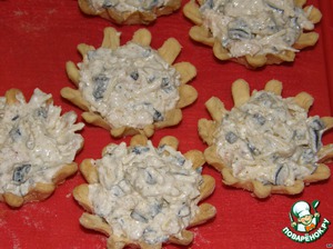 Творожно-креветочно- сырно-маслинной массой... ух, еле выговорила, наполняем тарталетки.