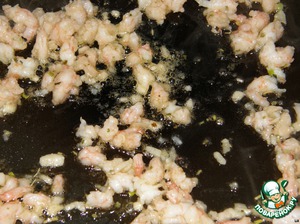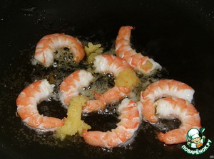 На разогретой сковороде с оливковым маслом обжариваем чесночок в течениe 30 сек. и добавляем нарезанные креветки.