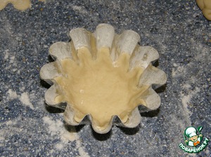 Смазав формочку маслом, аккуратно закладываем наше вырезанное тесто, слегка вытягивая края. Ставим в разогретую духовку (180 градусов) на 10 мин., этого вполне достаточно, т. к. тесто раскатано достаточно тонко. Формочку я ничем не заполняла, просто сделала несколько проколов ножом, чтобы тесто не поднималось.