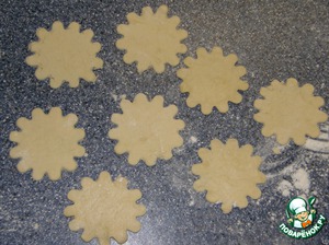 Раскатываем тонко тесто и формочкой для кексиков вырезаем вот такие волнистые кружочки.