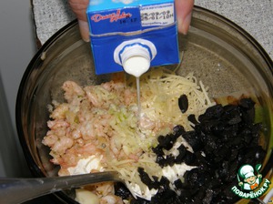 Творожную массу, измельченные маслины, натертый сыр, обжаренные креветки и выдавленный зубчик чеснока складываем в мисочку + щепотку соли и 1 ст. л. мёда. Все это заливаем сливками и хорошенько перемешиваем до образования однородной массы.