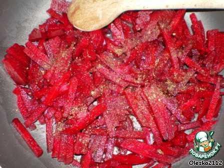 Свеклу режем соломкой, солим (слегка), добавляем уксус 1 ч. л. (лимонный сок), посыпаем молотым перцем, тушим в открытой сковороде до мягкости. В середине тушения добавляем томат.