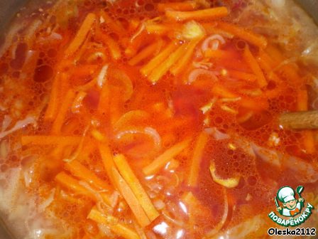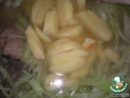 За 30 минут до окончания варки бульона кладём в него картофель и капусту, нарезанные соломкой.
