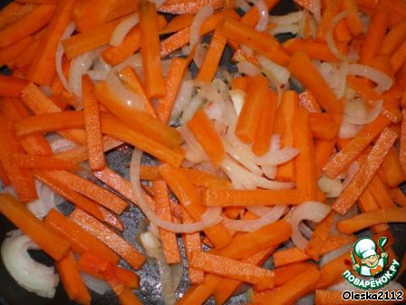 Лук, морковь, корень петрушки нарезаем соломкой и пассеруем на растительном масле (сливочном масле).