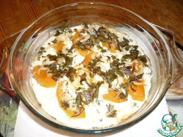 Тыкву нарезать тонкими ломтиками, и уложить слоем на рыбу. Тыкву поперчить и приправить мускатным орехом.