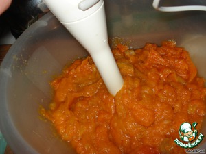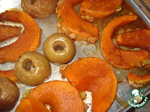 Противень тонко смазываем маслом, дольки тыквы смазываем маслом и посыпаем коричневым сахаром. С яблоками никаких манипуляций не проделываем! На противень кладём тыкву и яблоки и запекаем до готовности. Мякоть тыквы и яблок (ну, что с ней сделать? выскрести, выколупать? отделить от кожуры?) - одним словом, используется только мякоть яблок и тыквы. Пюрируем. У меня получилось много - я часть пюре использовала для другого блюда...