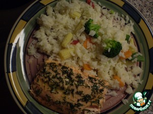 Вот так вышло! Очень сочно и вкусно!! Ничего лишнего только нежный вкус рыбки. И рис с овощами для полной гармонии. Рыбу не разрезанной заснять не успела всё уже успели разделить пока я отвлеклась.... Сфоткала свою порцию. Просто и вкусно ! Приятного аппетита!!