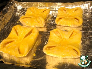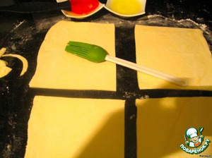 Квадрат делим на 4 маленьких квадратика и смазываем их белком.