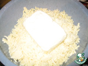 сулугуни натираем на крупной терке, я добавляю брынзу (люблю соленое), масло и яйцо - хорошо перемешиваем.