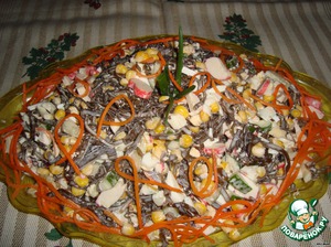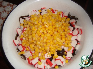 В капусту порезать колечками крабовые палочки, высыпать кукурузу.
