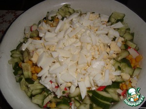 Добавить огурец и яйца, порезанные брусочками. Добавить майонез и перемешать.