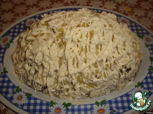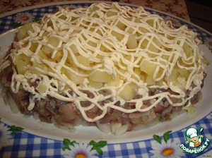 Потом слой мелко нарезанного картофеля и залить майонезом.