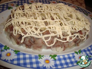 Филе нарезать мелко и выложить на плоское блюдо (слой примерно 3-4см). Сверху мелко нарезанный лук. И полить майонезом.