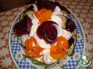 Морковь и свекла нарезать тонкими пластинами и сформировать розочки украсить форшмак. Между розами выложила "лепестки" из яиц. Готовый форшмак поставить на 1 час в холод.
