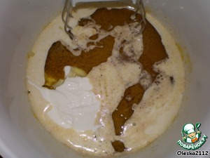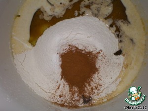Туда же просеянную муку,смешанную с разрыхлителем и корицу. Всё тщательно перемешиваем миксером. Тесто консистенции густой сметаны.
