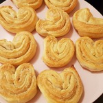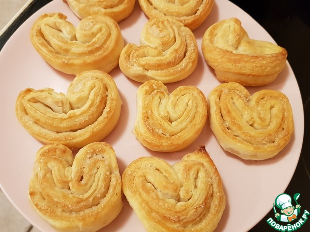 1. Растопить сливочное масло, добавить сахарный песок и размешать. (Не обязательно размешивать сахар до полного растворения, он должен просто равномерно распределиться. ) Присыпать поверхность стола просеянной мукой, смешанной с сахарным песком. Выложить на стол один лист слоеного теста. С помощью кулинарной кисточки смазать его маслом с сахаром. Накрыть вторым листом.