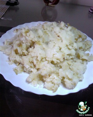 Пока тесто отдыхает, приготовить начинку. Отварить картофель в подсоленной воде (потом слить всю воду). Пока картофель горячий, размять специальной давилкой (не блендером, иначе будет очень жидкое пюре), посолить, поперчить, добавить половину поджаренного хрустящего лучка (с маслом, на котором он жарился, а можно пожарить на мелко нарезанном сале - тогда получатся шкварки), оставить остывать.
