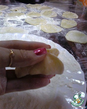 Уложить на присыпанную поверхность. Я выкладывала на тарелку, щедро присыпанную мукой, и на дощечку. Можно попробовать выкладывать на пищевую пленку, бумагу для выпечки. Только лучше перестраховаться и все же присыпать мукой. Очень будет жаль если тесто приклеится - вся начинка останется в кастрюльке.
