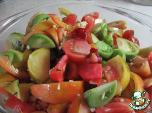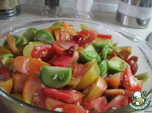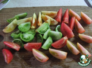 Помидорки режем на небольшие дольки. Мои помидоры пока дождались своей очереди, начали краснеть, но все равно остались очень плотными и с характерным запахом зеленых помидор.