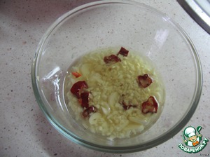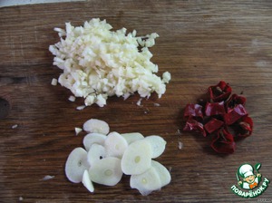 Чеснок измельчаем (можно через чесночницу, мне просто было лень ее потом мыть). Один зубок я порезала тонкими пластинками, т. к. больно злой попался чесночок (москалик, так называемый)! Перец очищаем от семян (если любите поострее, можно не заморачиваться). Можно использовать свежий, у меня такого не нашлось в хозяйстве и я взяла чуть подсушенный.