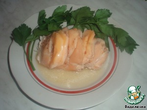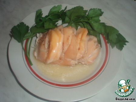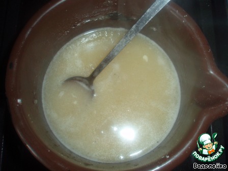 После разворачиваем, на дне фольги будет сок, его аккуратно слить в чашку. По рецепту запеченная грудинка подается с соусом, который готовиться так: берем сок (который слили в чашку)+вино (сухое белое 100г)+ сахар (1ст. л)+ сливочное масло (1ст. л). Поставить на огонь, довести до кипения и уварить в двое. Но мне этот соус не понравился, не знаю почему, может быть я вина перебавила.