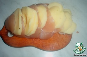 Берем грудинку, делаем в ней глубокие поперечные надрезы. Солим, перчим и вкладываем в каждый разрез по кружочку айвы.