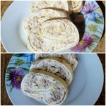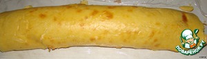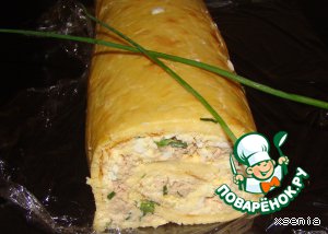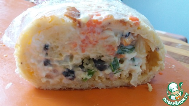 Сворачиваем в рулет. Заворачиваем в пленку и убираем в холодильник на пару часов