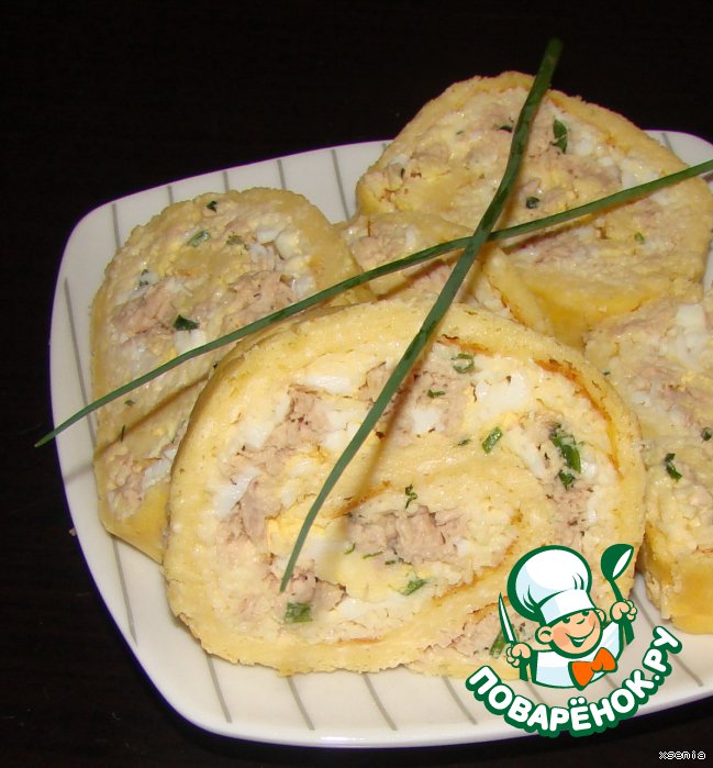 Рецептов салата Мимозы на сайте наверно под сотню. Но здесь, я хочу не то что бы сам рецепт салата показать, а идею оформления. Салат-рулет. Походный вариант. Хотя, почему только походный? Он и праздничный стол украсит