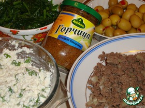 Творог соединить со сметаной, горчицей, нарезанной мятой и измельченным чесноком. Хорошо размешать. У меня творог был сухой, поэтому количество сметаны необходимо регулировать визуально. -