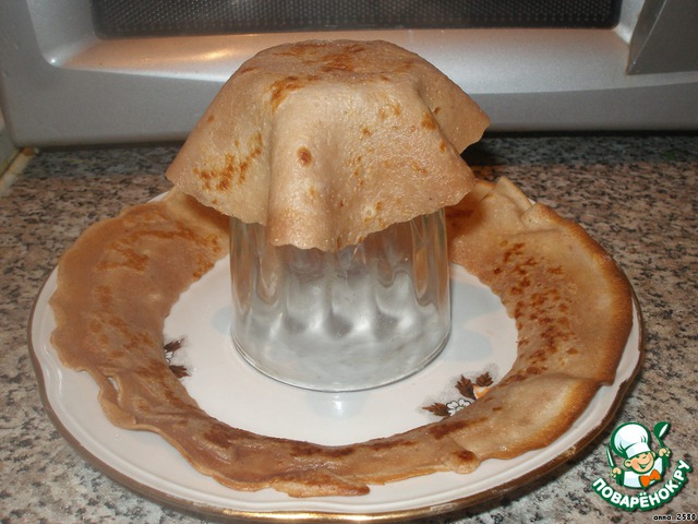 Если блинчики большие (как у меня), то можно их слегка уменьшить - вырезать ножом "заготовку" нужного для будущих тарталеток размера. Положить готовую заготовку на граненый стакан и отправить в микроволновку на 1,5 - 2 минуты при максимальной мощности. Если ставите сразу несколько стаканов с заготовками, то время увеличте.