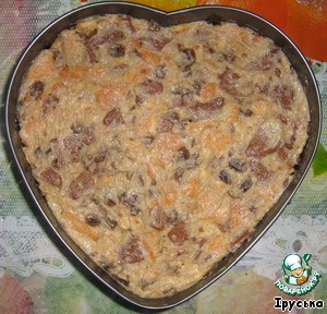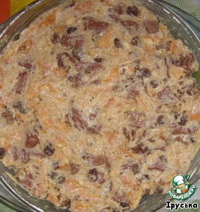 Добавить изюм, арахис, хорошо перемешать. Массу поделить на две части.