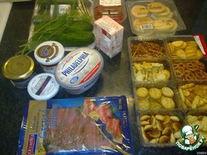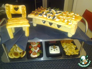 Главная часть идеи уже завершена.Теперь осталось сделать канапе ,что бы столик не пустовал.Для этого я использовала солёные крекеры начинённые сырным кремом(взбитым с небольшим количеством сливок в блендере)и икрой.Некоторые начинила оливковой пастой(сверху можно положить ломтики солёного огурца).А так же можно мини-блины (оладьи) с сырным кремом и солёным лососем.Украсить помодорками черри,ломтиками огурца,веточками укпопа!