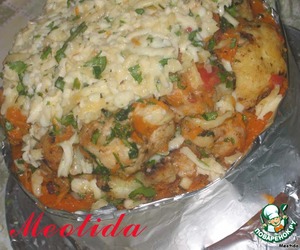выкладываем половину начинки в тыкву, посыпаем половиной сырно-яичной смеси (сыр надо натереть на крупной терке и смешать с молочно-яичной смесью, оставшейся от кляра для цветной капусты)