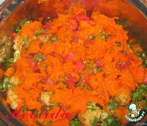 в глубокой миске смешиваем цветную капусту, измельченный чеснок и зелень, порезанный кубиками помидор (я с него сняла шкурку, предварительно положив помидорчик в кипяток), немного измельченной тыквы, все это надо хорошенько посолить, поперчить и перемешать