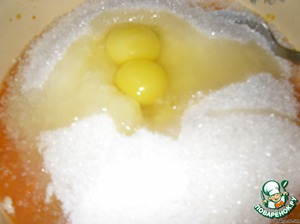 Далее муку просеять, смешать с разрыхлителем и добавить к оранжевой массе.