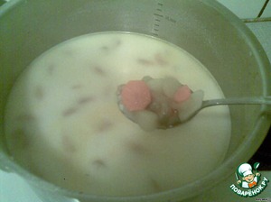 • картошку мелко нарезать и поставить варить, позже вместе с соком добавить грибы, немного посолить.