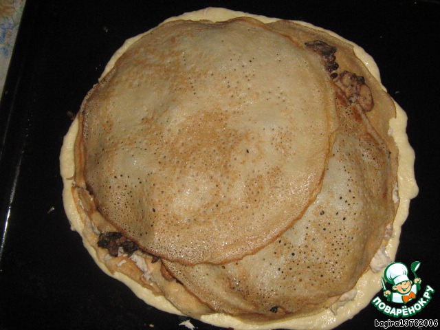 Теперь разделим тесто на две части - одна из них должна быть поменьше. Раскатаем меньшую часть и положим на смазанный маслом противень. Сверху плотно выложим слой блинчиков.