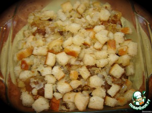 Ломтики белого хлеба нарезаем на кубики (1-1,5 мм), добавляем к луку и перемешиваем.