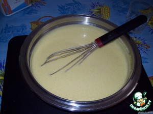 Вот такая масса получается. Ставим чашку на водяную баню и помешивая прогреваем до тех пор, пока не увеличится в три раза.