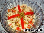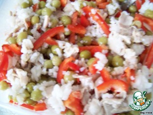 Очень простой, но, тем не менее, вкусный салат на основе куриного мяса и риса.