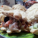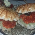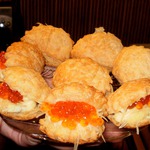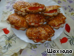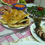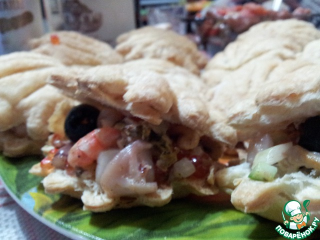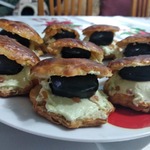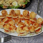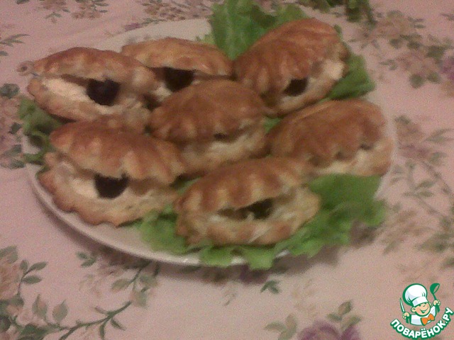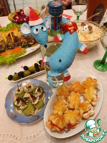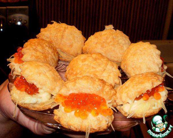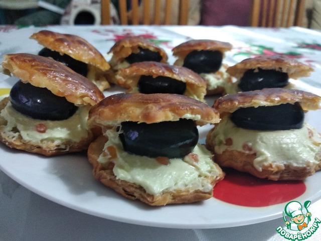 Как вариант я делала начинку: сливочный сыр+оливки, посыпать тертым сыром и украсить красной икрой.